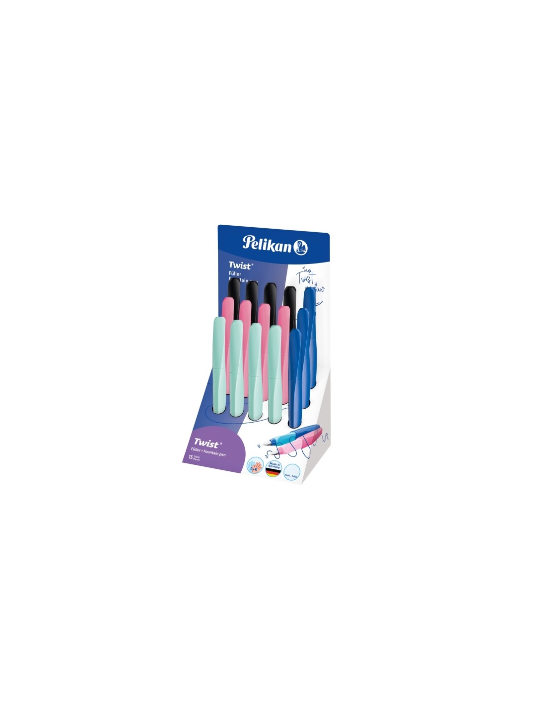 Pelikan Twist Expositor con 15 Plumas Estilograficas - Punta M - Uso Ambidiestro - Incluye Cartucho de Tinta - Colores