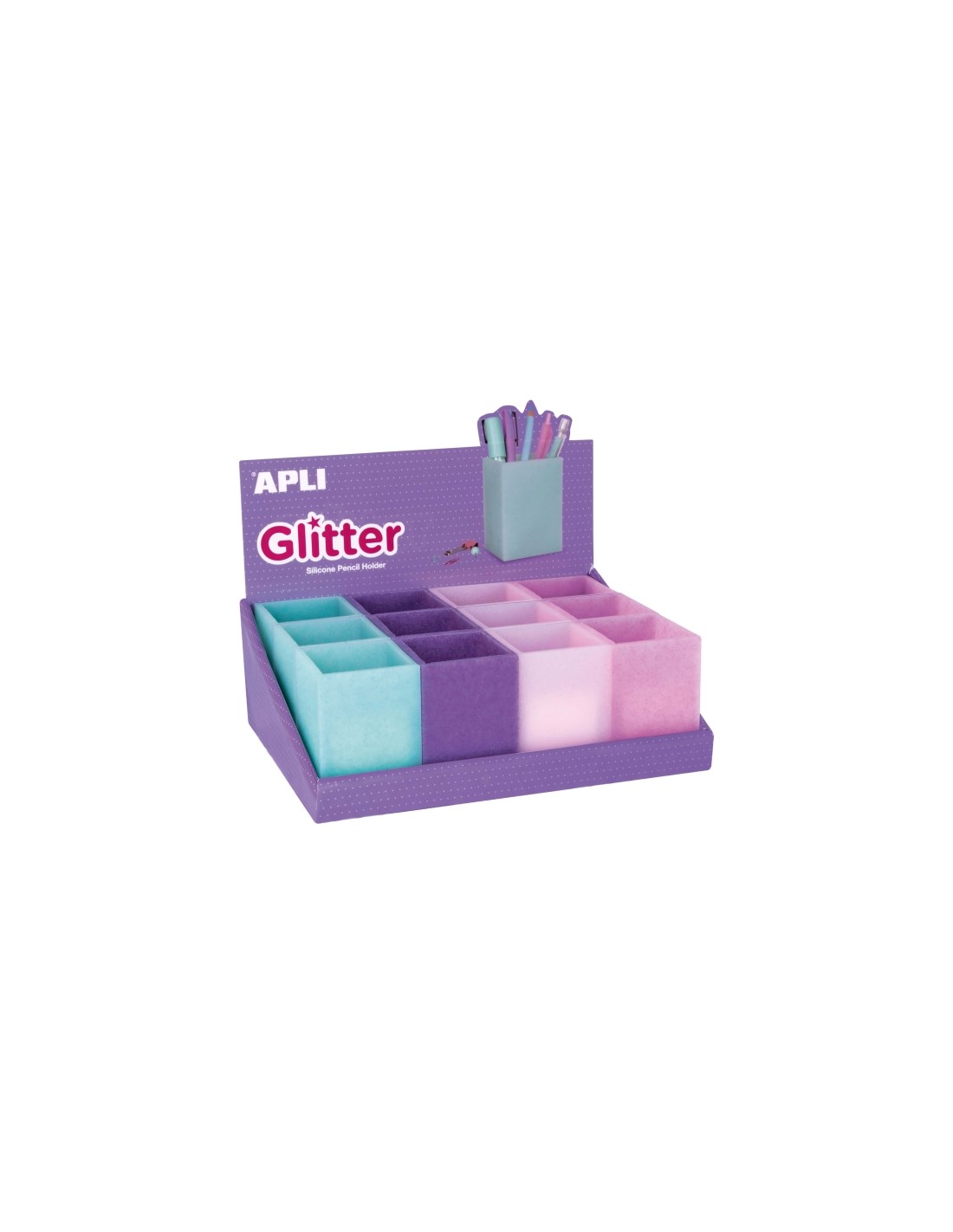 Apli Nordik Expositor de 12 Portalapices Silicona con Purpurina Cuadrados - Medidas 70x70x95mm - Colores Glitter Surtidos