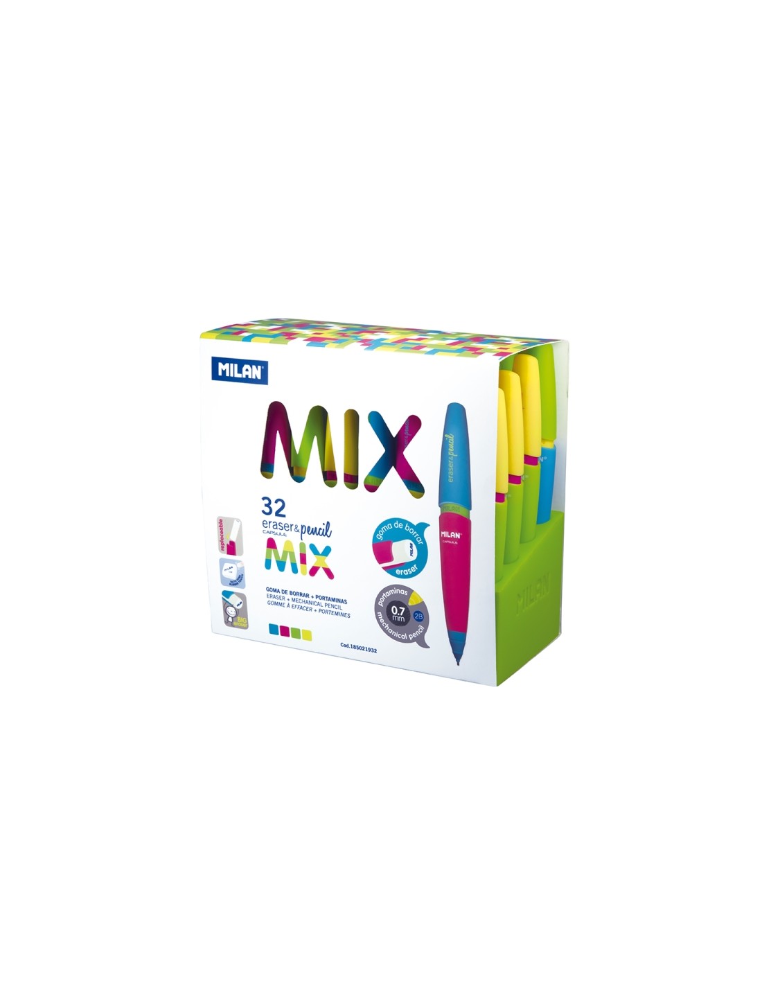 Expositor de 32 portaminas CAPSULE Mix de la marca Milan. Caracter sticas: -Expositor de 32 portaminas -Modelo: CAPSULE Mix -Mina: grafito 0.7mm -Dureza: 2B -Uso: escritura y dibujo art stico -Incluye: goma de borrar extra-grande MILAN -Minas de recambio -Colores: amarillo, azul, rosa, verde claro -Medidas: 13 x 1.8 x 1.6cm