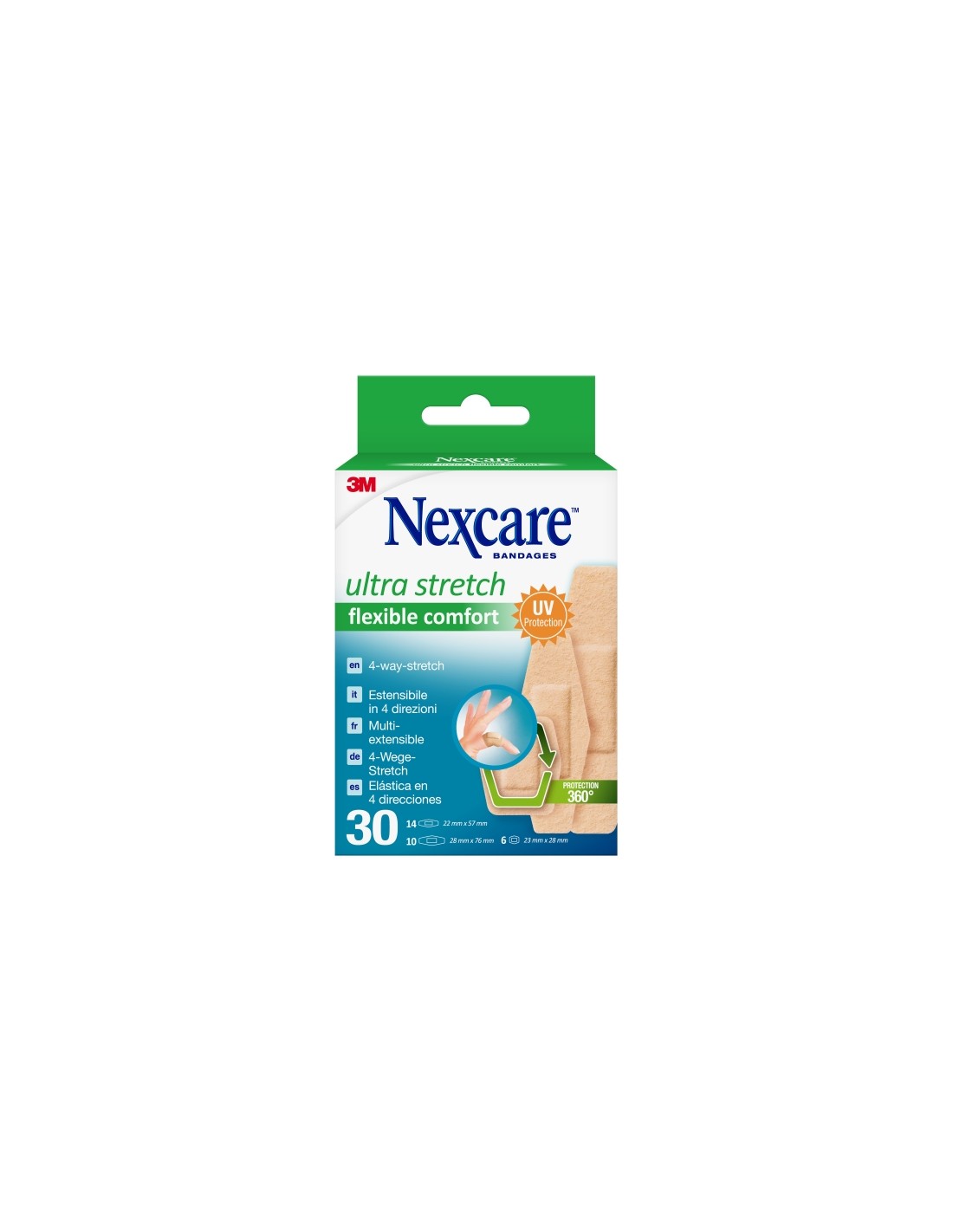 Los ap sitos Nexcare Flexible Comfort Ultra Stretch con forma ºnica est n dise ados para un mejor sellado alrededor de la almohadilla que asegura una protecci n 360 . Se estira y se ajusta incluso en nudillos y codos. El ap sito no est fabricado con l tex de origen natural. El material de la tira cuenta con un el stico en 4 sentidos para adaptarse al cuerpo que proporciona movilidad y protecci n en heridas a toda la familia. Un paquete contiene 30 ap sitos: 10 piezas-28mm x 76 mm, 14 piezas-22mm x 57 mm, 6 piezas-23mm x 28 mm. Los ap sitos Nexcare Flexible Comfort Ultra Stretch est n hechos para mantenerte en movimiento y posibilitar tu actividad como de costumbre, a pesar de cortes, abrasiones o quemaduras menores. Fabricadas con material altamente transpirable para una comodidad excepcional y adhesivo resistente al agua que evita que se suelte cuando est mojado. Material el stico que se adapta y se flexiona al realizar tareas cotidianas como jardiner a, trabajos con teclado o ejercicios de yoga. Ajuste c modo y flexible que te hace olvidar que lo llevas puesto. Cobertura y protecci n de heridas leves mientras se curan. Caracter sticas: -El stico en 4 sentidos -Dise o ºnico para un mejor sellado alrededor de la herida -El material acolchado y altamente transpirable ayuda a proteger la herida mientras se cura -El avanzado adhesivo resistente al agua se adhiere a la piel h ºmeda o sudorosa -Fabricaci n sin l tex de origen natural -Unidades por paquete: 30 -10 (28mm x 76 mm)
