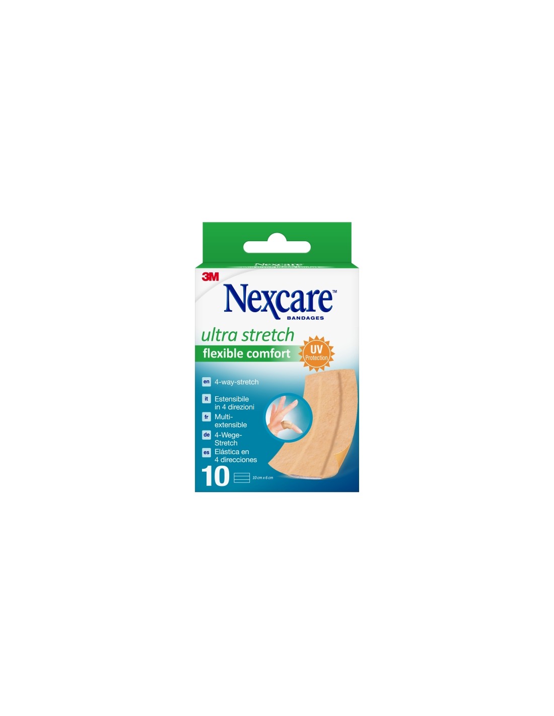 Las tiras Nexcare Flexible Comfort Ultra Stretch Bands son muy c modas y permiten que la piel transpire. El material de la tira cuenta con un el stico en 4 sentidos que proporciona movilidad y protecci n en heridas a toda la familia. Un paquete contiene 10 ap sitos: 6cm x 10 cm. Las tiras Nexcare Flexible Comfort Ultra Stretch Bands est n hechas para mantenerte en movimiento y posibilitar tu actividad como de costumbre, a pesar de cortes, abrasiones o quemaduras menores. Fabricadas con material altamente transpirable para una comodidad excepcional y adhesivo resistente al agua que evita que se suelte cuando est mojado. Material el stico que se adapta y se flexiona al realizar tareas cotidianas como jardiner a, trabajos con teclado o ejercicios de yoga. Ajuste c modo y flexible que te hace olvidar que lo llevas puesto. Caracter sticas: -El stico en 4 sentidos -Se puede cortar al tama o deseado -El material acolchado y altamente transpirable ayuda a proteger la herida mientras se cura -El avanzado adhesivo resistente al agua se adhiere a la piel h ºmeda o sudorosa -Fabricaci n sin l tex de origen natural -Unidades por paquete: 10 Especificaciones: -Color de producto: Marr n claro -Contenido del embalaje: 10/pack -C digo de barras de farmacia: 367102.6 -Impermeable: No -Zona de uso: Cualquier parte del cuerpo -Propiedades: Transpirable, flexible, sin l tex -Tipo de Producto: Tiras Protectoras Dimensiones: -Anchura total (sistema m trico): 60 mm -Longitud total: 100 mm