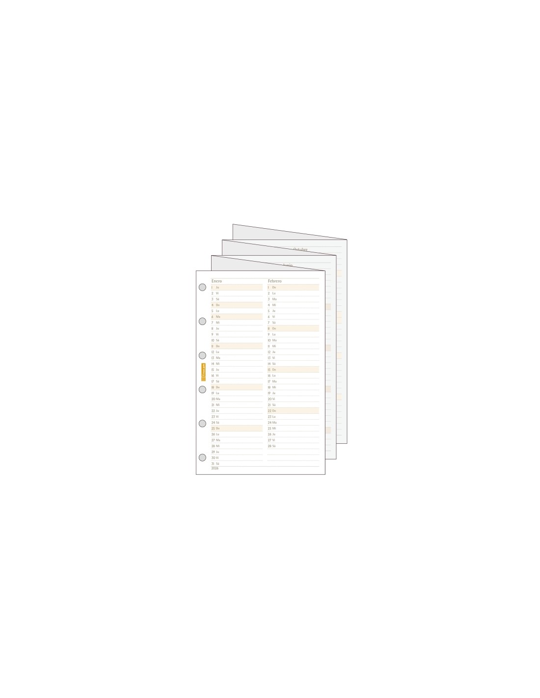 Recambio anual extensible para agendas de anillas Finocam Classic. Visi n completa del a o desplegado en dos semestres: de enero a junio delante, de julio a diciembre detr s. Ideal para las tareas de la planificaci n del a o. La anualidad contiene los festivos nacionales. Caracter sticas: -Periodo: Enero 2026 -Diciembre 2026 (12 meses) -Caracter sticas destacables: Los art culos Finocam est n dise ados para optimizar tu organizaci n personal, haciendo tu vida m s pr ctica, c moda y a la vez m s bella. -Duraci n agenda/calendario: 12 meses (enero-diciembre) -Materiales principales: Papel. -Gramaje del papel: 120g/m -Papel: Papel FSC ecol gico libre de cloro elemental y de cido, fabricado mediante la utilizaci n de energ as limpias, con el 100 de celulosa controlada, y bajo los certificados de calidad ISO9001:2015 y medio ambiente ISO14001:2015, cumpliendo as la normativa ISO9706 sobre la permanencia del papel. El Forest Stewardship Council (FSC ) es una organizaci n no gubernamental, independiente, sin nimo de lucro, establecida para promover una gesti n forestal ambientalmente responsable, socialmente beneficiosa y econ micamente viable en los bosques de todo el mundo. -Peso: 6g -Medidas exteriores: 73x1x114mm -N ºmero de taladros/anillas: La distancia en mil metros entre el centro de cada taladro es de 19-19-19-19-19.