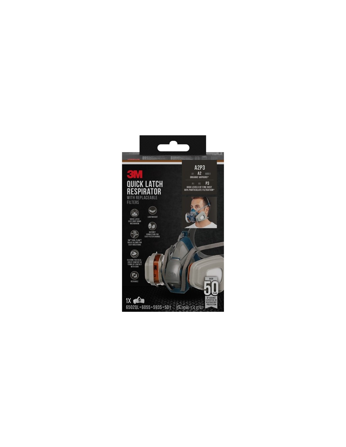 3M 6502QLKIT-1 es un kit completo de protecci n respiratoria que contiene una mascarilla de media cara reutilizable y filtros reemplazables, que se pueden usar al pintar o lijar. Incorpora con un mecanismo de cierre r pido que facilita el acceso y salida de reas contaminadas. Con clasificaci n A2 contra vapores org nicos y P3 con filtraci n del 99 de part culas en niveles altos de polvo fino y niebla. Utiliza el kit de protecci n respiratoria completo 3M 6502QLKIT-1 con mascarilla de media cara reutilizable y filtros reemplazables para ayudar a proporcionar protecci n A2 y P3 al pintar con espray, brocha y rodillo, lijar o cuando trabaje con herbicidas y pesticidas. Est dise ada para brindar protecci n A2 contra ciertos gases y vapores org nicos como pintura base solvente, adhesivos y detergentes de limpieza y protecci n P3 contra niveles altos de polvo fino y nieblas a base de aceite o agua. Con el mecanismo de cierre r pido de que dispone, resulta f cil desplegar la mascarilla apart ndola de la cara sin necesidad de quitar las cintas de la cabeza. Facilita entrar y salir de zonas contaminadas y trabajar c modamente durante periodos prolongados. La v lvula de exhalaci n 3M Cool Flow permite respirar con facilidad. Cumple con las normas europeas y es compatible con protecciones oculares y auditivas de 3M. Caracter sticas: -KIT DE MASCARILLA DE MEDIA CARA REUTILIZABLE ADECUADA PARA: Pintura en espray, pintura con brocha y rodillo y lijado o cuando se trabaja con herbicidas y pesticidas -PROPORCIONA PROTECCI N RESPIRATORIA A2P3: protecci n A2 contra ciertos gases y vapores org nicos como pintura base solvente, adhesivos y detergentes de limpieza, y protecci n P3 con filtraci n del 99 de part culas en niveles medios de polvo fino y niebla -CAMBIO DE FILTRO DE CARTUCHO SEGURO Y F CIL: la conexi n de bayoneta 3M permite que los cartuchos y filtros 3M encajen de manera eficiente en su sitio -DISE ADO PARA LA COMODIDAD Y EL CONFORT: con el mecanismo de cierre r pido de que dispone, resulta f cil de desplegar apart ndolo de la cara sin necesidad de quitar las cintas de la cabeza. El sello facial de silicona resistente ayuda a brindar comodidad y estabilidad con un sello suave pero firme -DISE ADO PARA FACILITAR LA RESPIRACI N: la v lvula de exhalaci n 3M Cool Flow ayuda a liberar el aliento exhalado c lido y h ºmedo desde el interior de la mascarilla de media cara -EXPERIENCIA CONFIABLE DE 3M: m s de 50 a os de experiencia cient fica en protecci n respiratoria -Cumple con las normas europeas 6502QL: EN 140:1998, 6055: EN 14387:2004 A1:2008 A2, 5935: EN 143:2021 P3 (CE 2797, UKCA 0086) -El kit contiene: 1 mascarilla de media cara con cierre r pido 3M 6502 de tama o mediano, 1 par de filtros 3M 6055 A2, 1 par de filtros 3M 5935 P3 y 1 par de retenedores de filtro 3M 501 Especificaciones: -Color: Gris, azul -Material del filtro: Carb n activado/Polipropileno -Tipo de producto: Media M scara -Material: Silicona