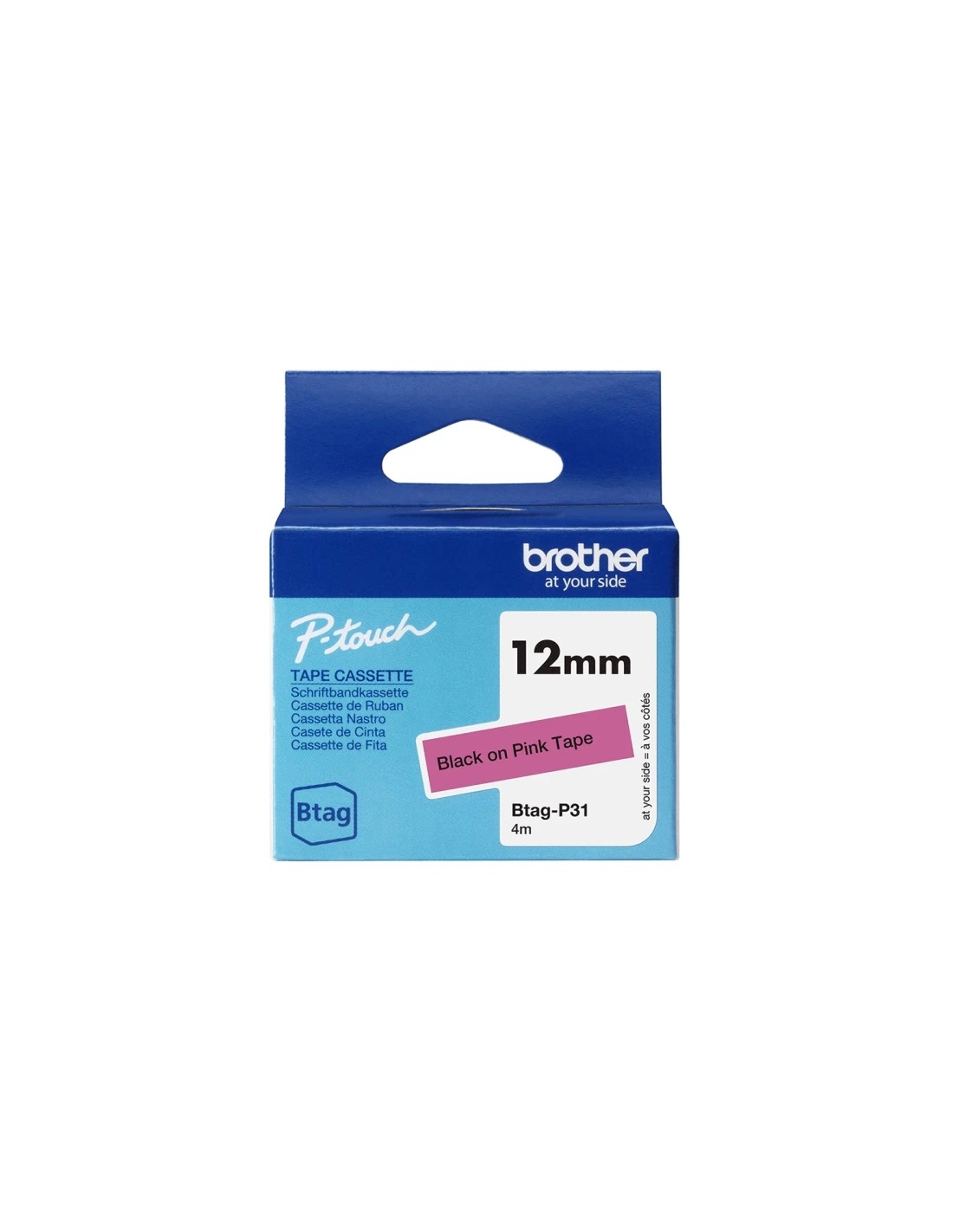 Brother Btag-P31 Cinta 12mm - Texto Negro sobre Fondo Rosa - Medidas 12mmx4 Metros - Apta para PTN10-PTN20-PTN25BT