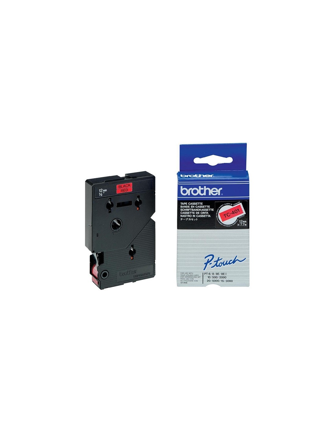 Brother TC401 Cinta Laminada Original para Rotuladora Características: -Texto negro sobre fondo rojo -Ancho de 12 mm -Longitud: 7 metros Rendimiento: Ancho 12mm x 7 metros