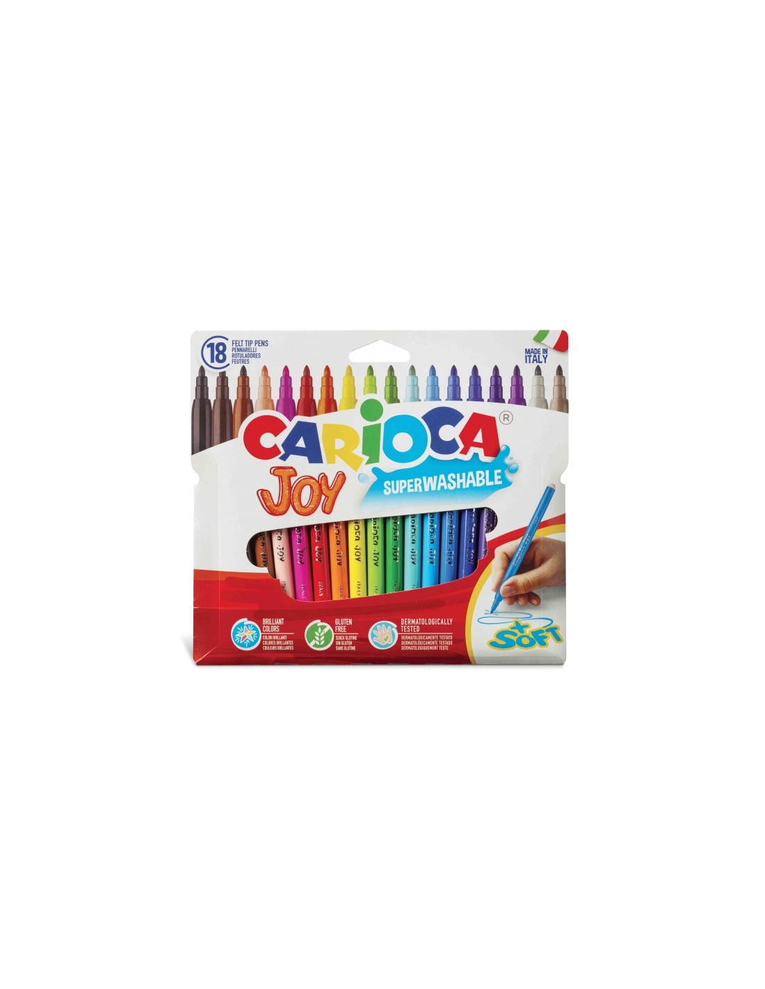 Carioca Joy Pack de 18 Rotuladores - Tinta Superlavable - Punta Fina 2.8mm - Bloqueada - Tapa Ventilada Características: -Pack de 18 rotuladores JOY -Tinta superlavable -Punta fina 2,8 mm, bloqueada y con tapa ventilada -Made in Italy
