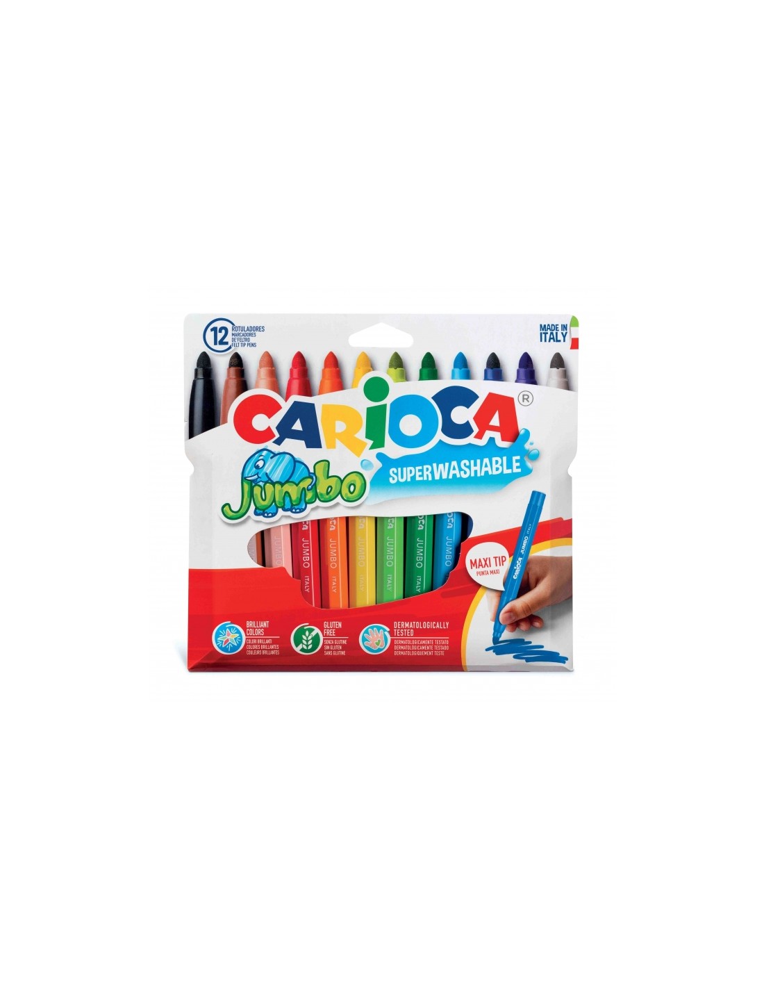 Carioca Jumbo Pack de 12 Rotuladores - Cuerpo Octogonal Maxi - Tinta Superlavable - Punta Maxi 6mm Bloqueada - Tapa Ventilada Características: -Pack de 12 rotuladores JUMBO -Cuerpo octogonal Maxi -Tinta superlavable -Punta Maxi 6 mm, bloqueada y con tapa ventilada -Made in Italy