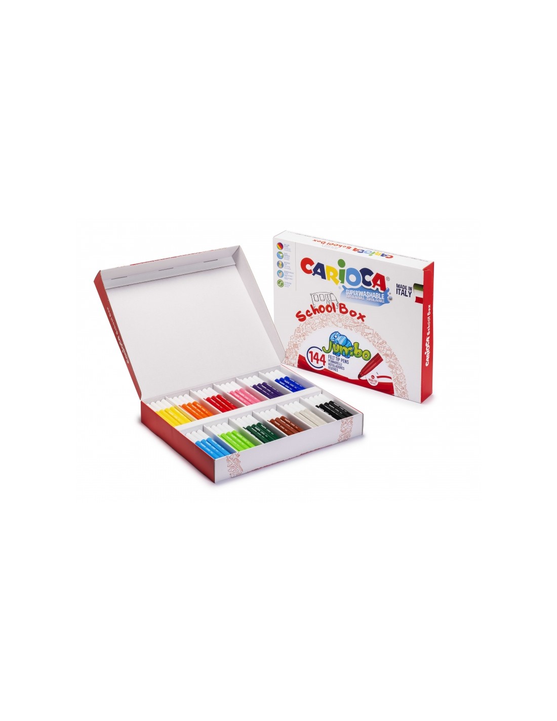 Carioca Jumbo School Box Pack de 144 Rotuladores - Cuerpo Octogonal Maxi - Tinta Superlavable - Punta Maxi 6mm Bloqueada - Tapa Ventilada Características: -Pack de 144 rotuladores JUMBO -Cuerpo octogonal Maxi -Tinta superlavable -Punta Maxi 6 mm, bloqueada y con tapa ventilada -Made in Italy