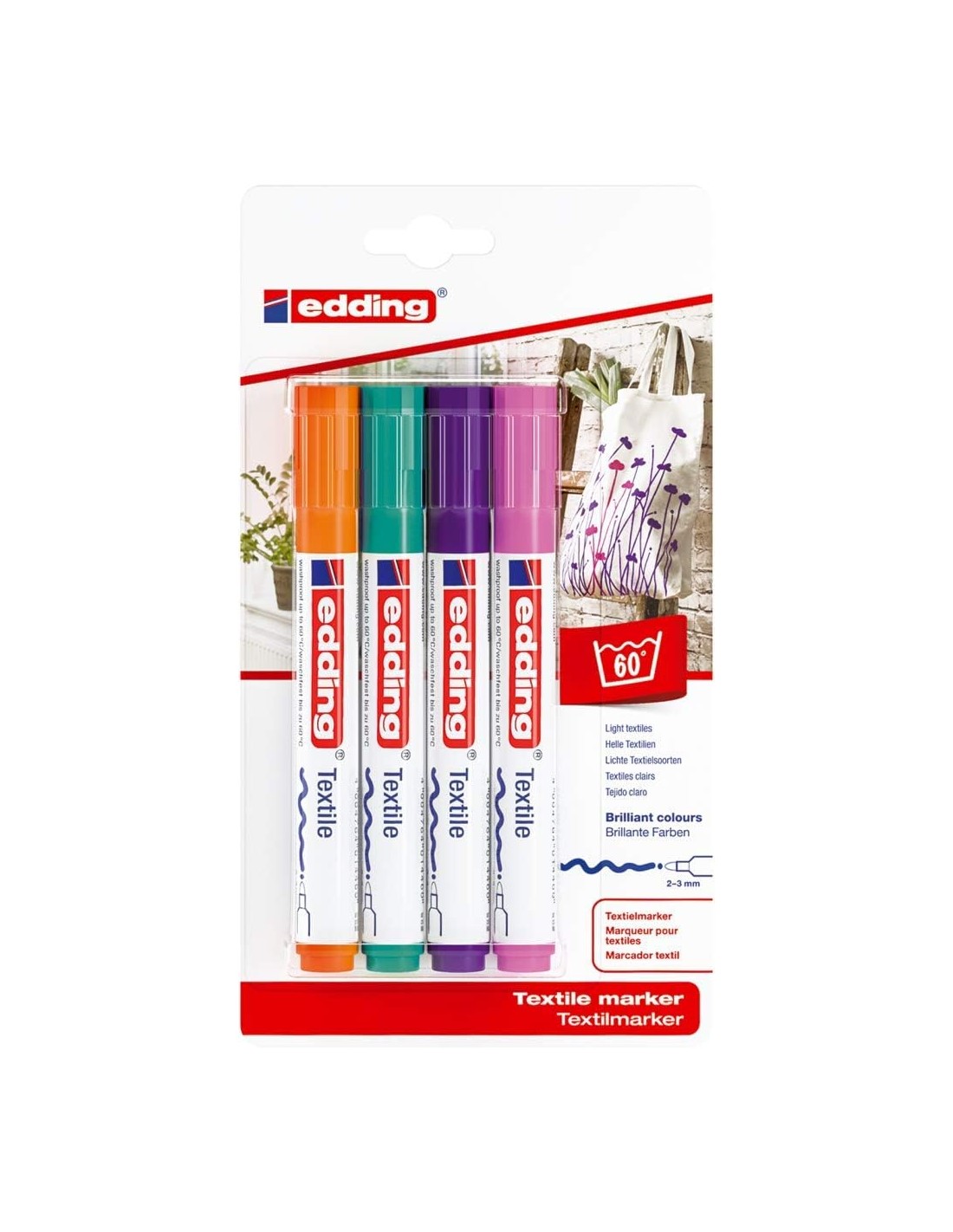 Te gustaría adornar las camisetas de los niños con dibujos O qué tal escribir un mensaje personalizado en el pijama del bebé Tal vez dibujar en cojines para decorarlos o renovar el tapizado viejo de una silla El edding 4500 marcador textil ofrece una gran calidad y una excelente definición en multitud de tejidos no tratados químicamente de colores suaves, como algodón y lino, y en diversos tejidos mixtos. Después de dibujar sobre el material elegido, puedes fijar la tinta que hayas aplicado planchándolo una vez (sin vapor). En adelante, tu diseño será resistente a los lavados hasta a 60 C. El marcador cuenta con una resistente punta redonda de 2-3 mm de grosor y está disponible en una gran variedad de colores sorprendentes y tonos fluorescentes. Para uso limitado sobre poliéster, ya que es frecuente que se corra la tinta. Recomendamos usar el marcador textil edding 8040 para escribir sobre poliéster (p. ej., prendas deportivas). Características: -Marcador textil para decorar y dibujar de forma resistente al lavado sobre la mayoría de textiles claros, como el algodón, la seda y el lino. -El grosor de trazo de la punta redonda es de 2-3 mm -Tinta pigmentada a base de agua, de olor neutro, de secado rápido y extremadamente resistente a la acción de la luz. -Resistente al lavado hasta 60 C tras fijar la tinta planchando la prenda (sin vapor). -Artículo disponible en 20 colores distintos. Especificaciones: -Forma de la Punta: Punta redonda -Grosor de trazo: 2-3 mm -Permanente -Olor neutro -Resistente al Agua -Extremadamente resistente a la Luz -Secado rápido -Capuchón puede reposicionarse -Colores: Naranja, Verde Palido, Violeta y Rosa Especificaciones: -Pack de 4uds.