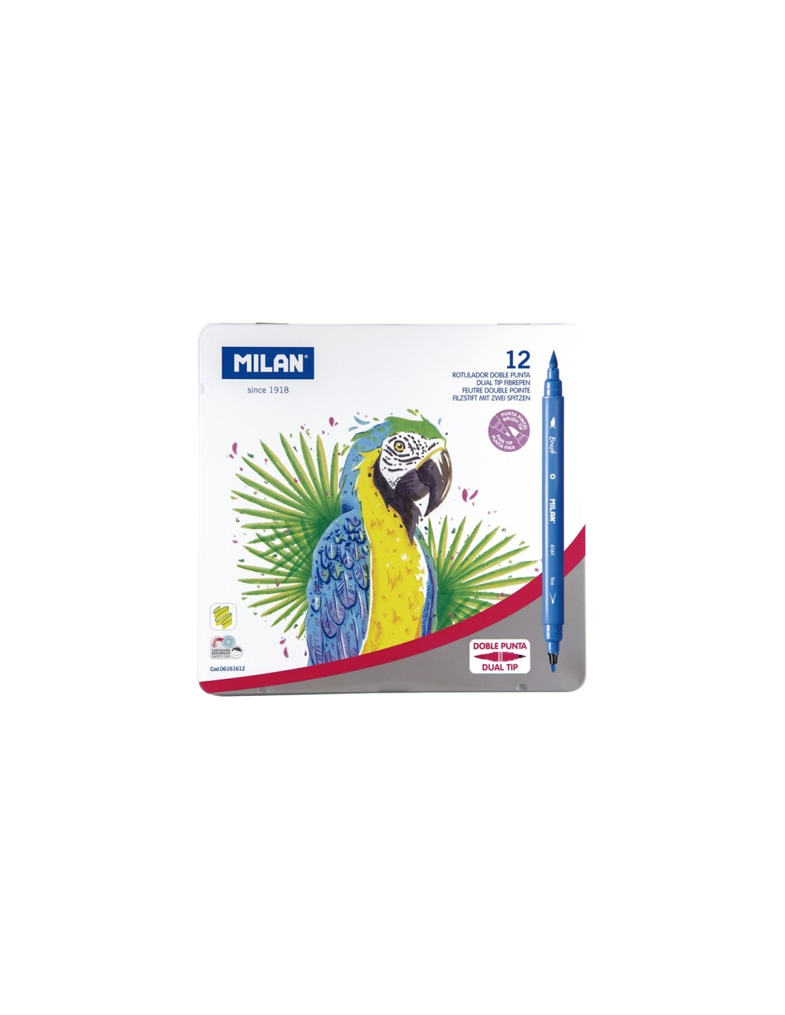 Milan Pack de 12 Rotuladores Doble Punta - Caja Metalica - Punta Fina 2mm - Pincel 0.5 a 4mm - Colores Surtidos