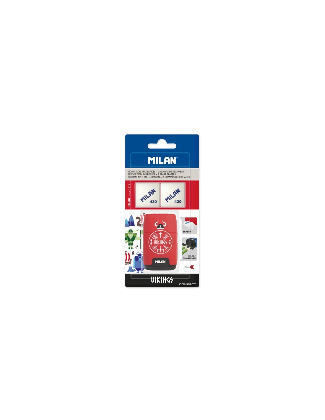 El bl ster de afilaborra COMPACT Vikings de Milan combina una goma de borrar y un sacapuntas doble con dep sito en un dise o compacto y seguro. Caracter sticas: -Producto: Bl ster de afilaborra COMPACT Vikings -Goma de borrar cuadrada -Sacapuntas doble con dep sito -Sacapuntas: -Ranuras: est ndar y MAXI -Cuchilla: acero afilado y resistente -Sistema de seguridad: evita separaci n de cuchilla -Dise o: compacto, original, desarrollado por I D Milan -Serie: Vikings (especial) -Colores: surtidos (rojo, verde, azul) -Goma de borrar: -Material: caucho sint tico \ miga de pan\ -Caracter sticas: suave, efectiva -Incluye: 2 gomas de recambio (ref. 430)