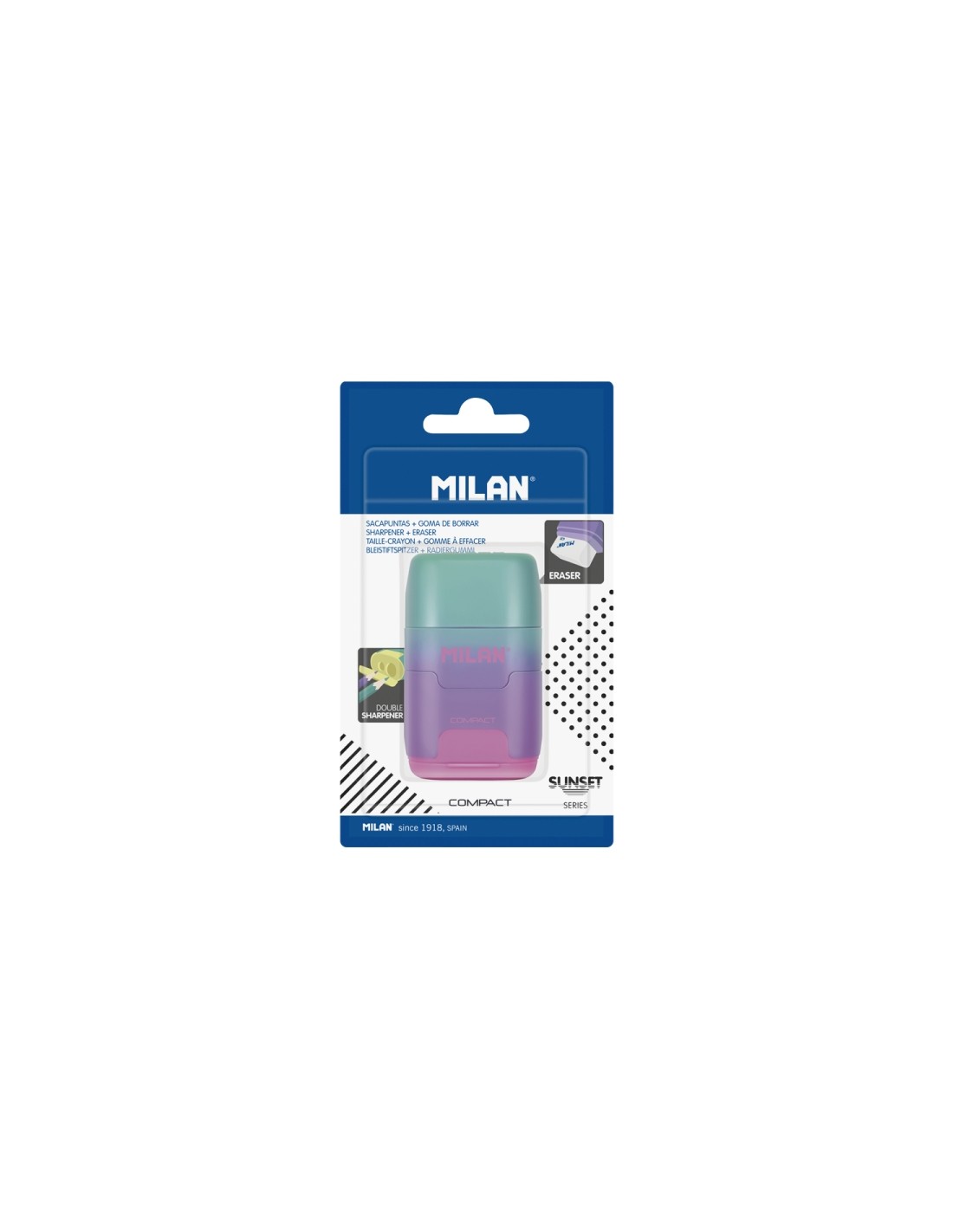 El bl ster afilaborra COMPACT Sunset lila de Milan combina una goma de borrar y un sacapuntas doble en un dise o compacto y funcional. Caracter sticas: -Serie: Sunset -Modelo: Bl ster afilaborra COMPACT Sunset lila -Composici n: -Goma de borrar cuadrada -Sacapuntas doble -Dise o: compacto, original, en colores: verde, lila, rosa -Goma de borrar: -Material: caucho sint tico de alta calidad -Forma: cuadrada -Funci n: limpieza y correcci n en diferentes papeles -Sacapuntas: -Cuchilla: acero afilado y resistente -Uso: todo tipo de l pices -Dep sito: recoge virutas -Seguridad: sistema que evita separaci n de cuchilla del cuerpo -Creaci n: departamento de I D de Milan -Accesorios: gomas de borrar de recambio (modelo 430)