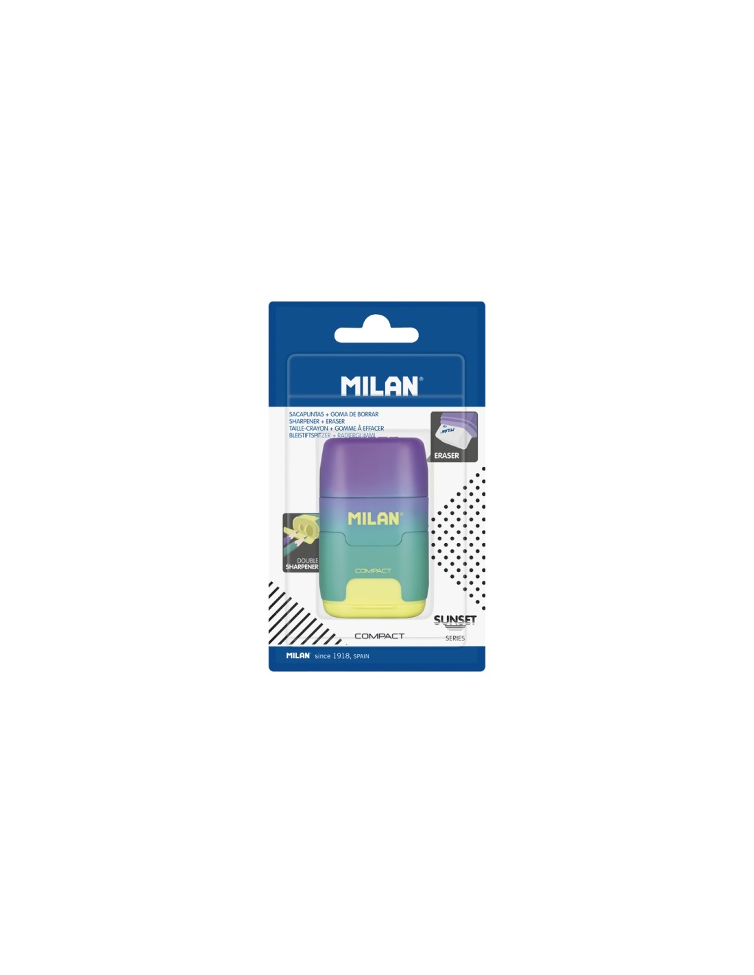 Bl ster de la serie COMPACT Sunset en color turquesa que incluye una goma de borrar y un sacapuntas doble con dep sito y cuchilla de acero. Caracter sticas: -Serie: COMPACT Sunset -Color: Turquesa -Goma de borrar: cuadrada, caucho sint tico, \ miga de pan\ , suave, eficaz -Sacapuntas doble: -Versiones: est ndar y MAXI -Dep sito para restos -Cuchilla: acero, afilada, resistente -Compatible con todo tipo de l pices -Sistema de seguridad: evita separaci n de hoja -Dise o: original, parte de la serie Sunset, creado por I D Milan -Accesorios: gomas de borrar de recambio (modelo 430)