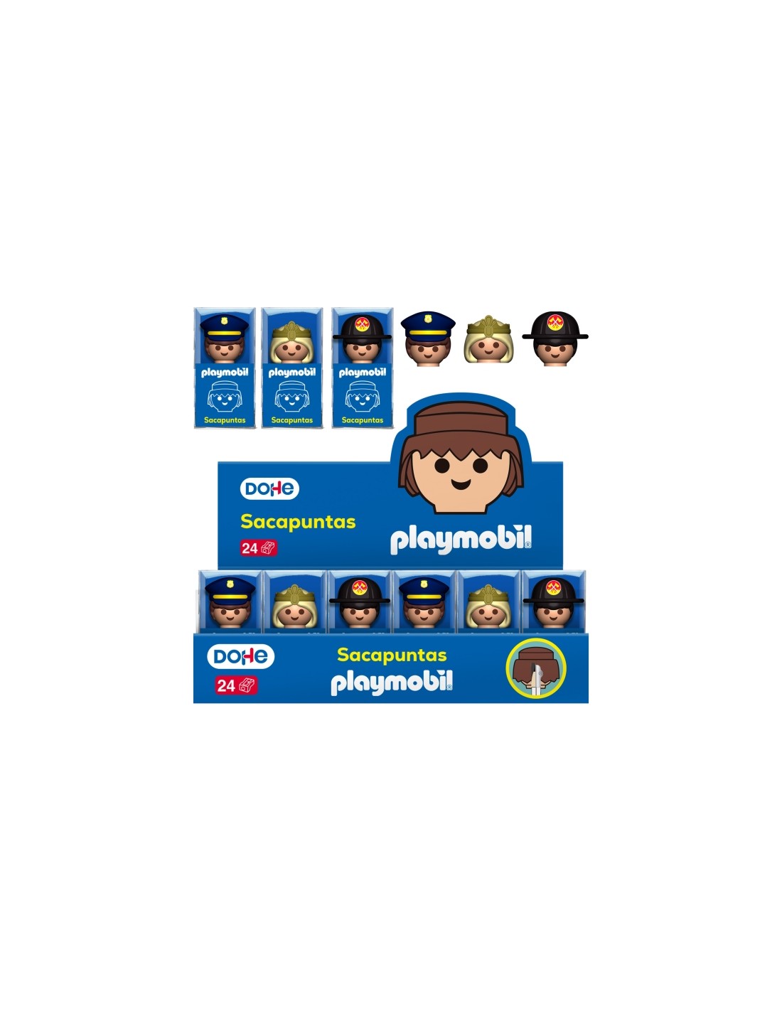 Expositor de 24 unidades de sacapuntas con forma de mu ecos Playmobil polic a, bombero y princesa. Con cuchilla de acero. Se presenta en caja transparente individual y en expositor de sobremesa. Especificaciones: -1 Orificio -Cuchilla de Acero -Decorados Playmobil Policia, Bombero y Princesa
