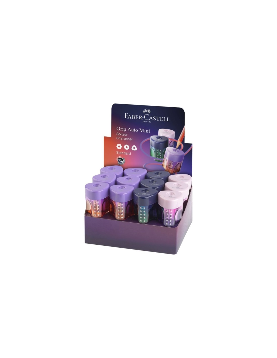 Faber-Castell Grip Mini Flow Edition Expositor con 24 Sacapuntas de 1 Orificio Caracter sticas: -Sacapuntas de calidad para un afilado sencillo y limpio. -Apto para l pices de grafito y de colores. -Para l pices de forma est ndar. -Con dep sito para un uso limpio y almacenamiento. -Dise o atractivo con degradado de color. -Con tornillo de seguridad.