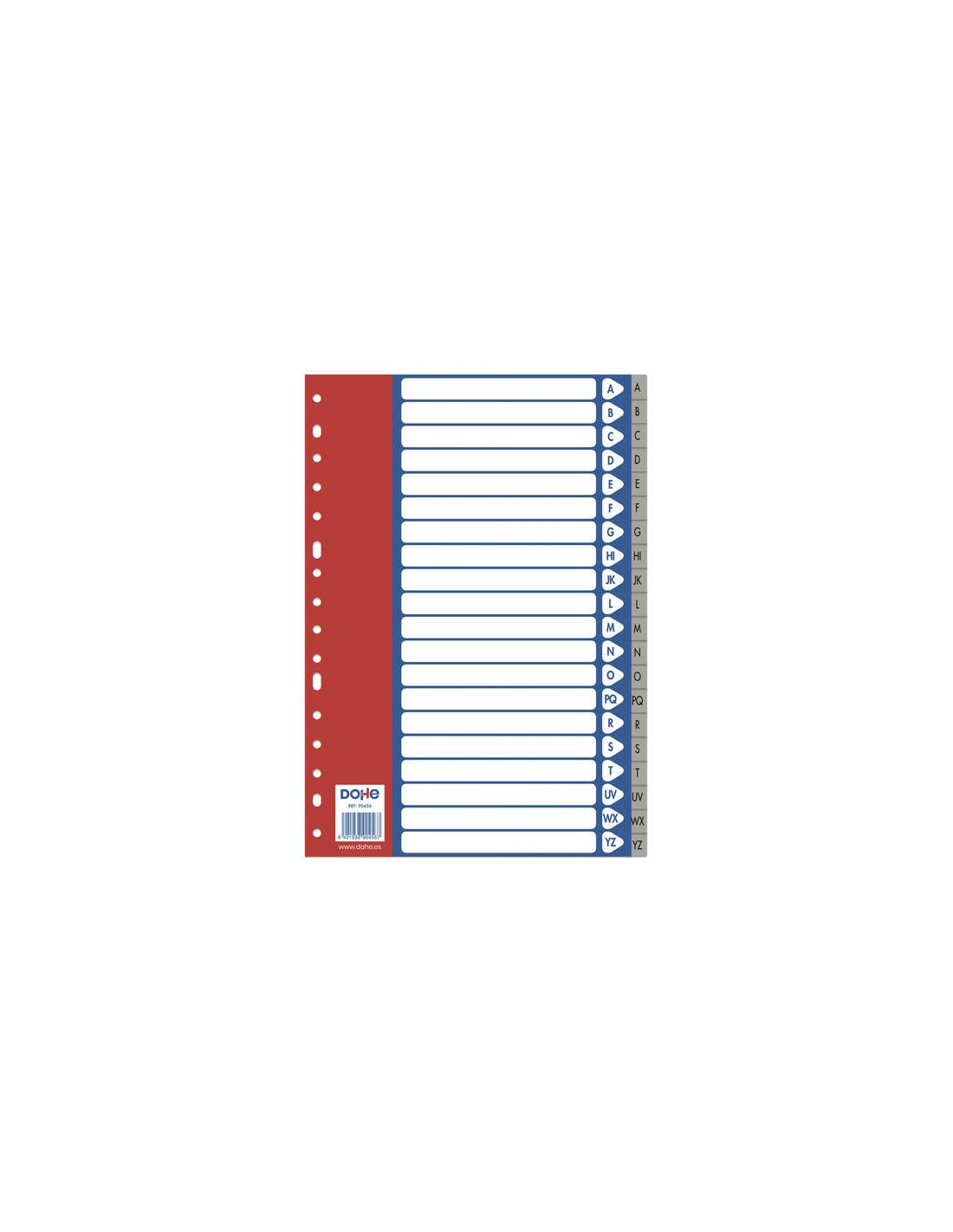 Separadores para archivadores y carpetas de anillas. Fabricados en polipropileno de 120 micras con multitaladro de 16 perforaciones. Se sirven en bolsa autoadhesiva individual.