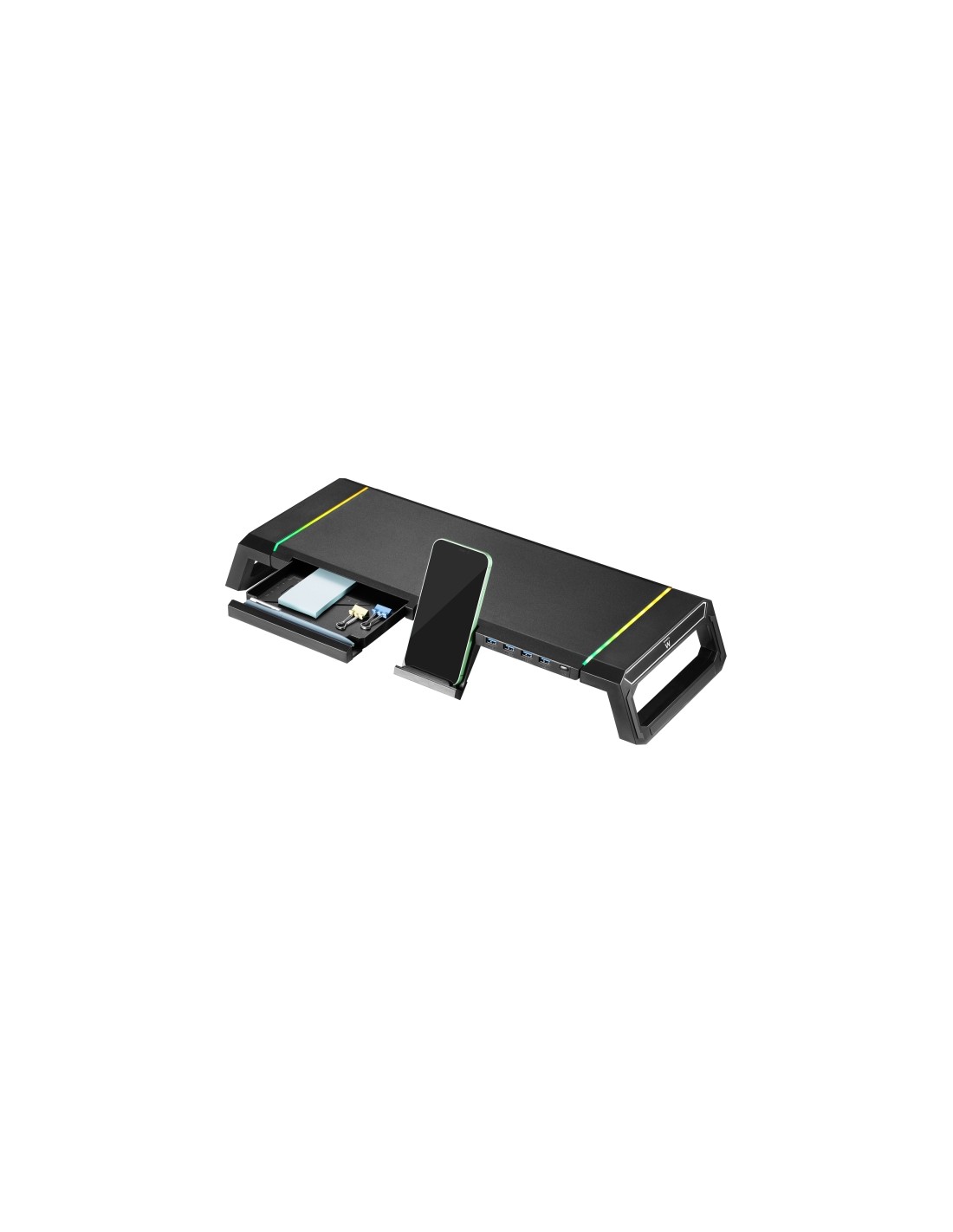 Ewent EW1268 Elevador para Monitor RGB Extensible - Plegable con cajon y soporte para smartphone - HUB USB 3.0 de 4 Puertos -