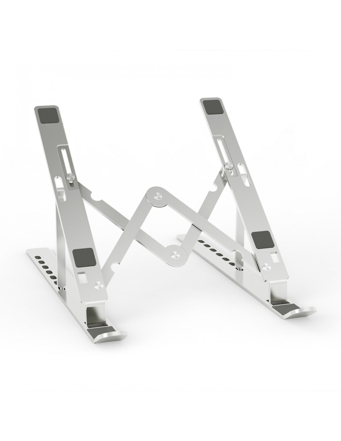 -Soporte de sobremesa ajustable para portátil o Tablet. -Este soporte es totalmente plegable y súper compacto. Se puede guardar fácilmente en una mochila, bolso o maleta cuando viaja y ahorra espacio. -Ofrece un total de 7 opciones de altura, lo que ayuda a corregir su postura y reducir el dolor de espalda, rigidez del cuello, dolores de muñeca y tensión ocular. Muy ergonómico y cómodo para leer y escribir. -Las patas de silicona antideslizantes protegen su dispositivo de posibles arañazos y deslizamientos, y las almohadillas antideslizantes inferiores evitan que el soporte se deslice en la mayoría de las superficies resbaladizas. -Fabricado con una resistente aleación de aluminio, la parte superior puede soportar un peso máximo de 3 kg -Este soporte es compatible con todos los portátiles / tablet de 10-15 pulgadas. -El diseño propone una gran disipación de calor y un flujo de aire natural para evitar que su portátil se sobrecaliente. -Color: Plata -Contenido -1 x Soporte de sobremesa plegable y ajustable para portátil o Tablet -1 x Funda para soporte
