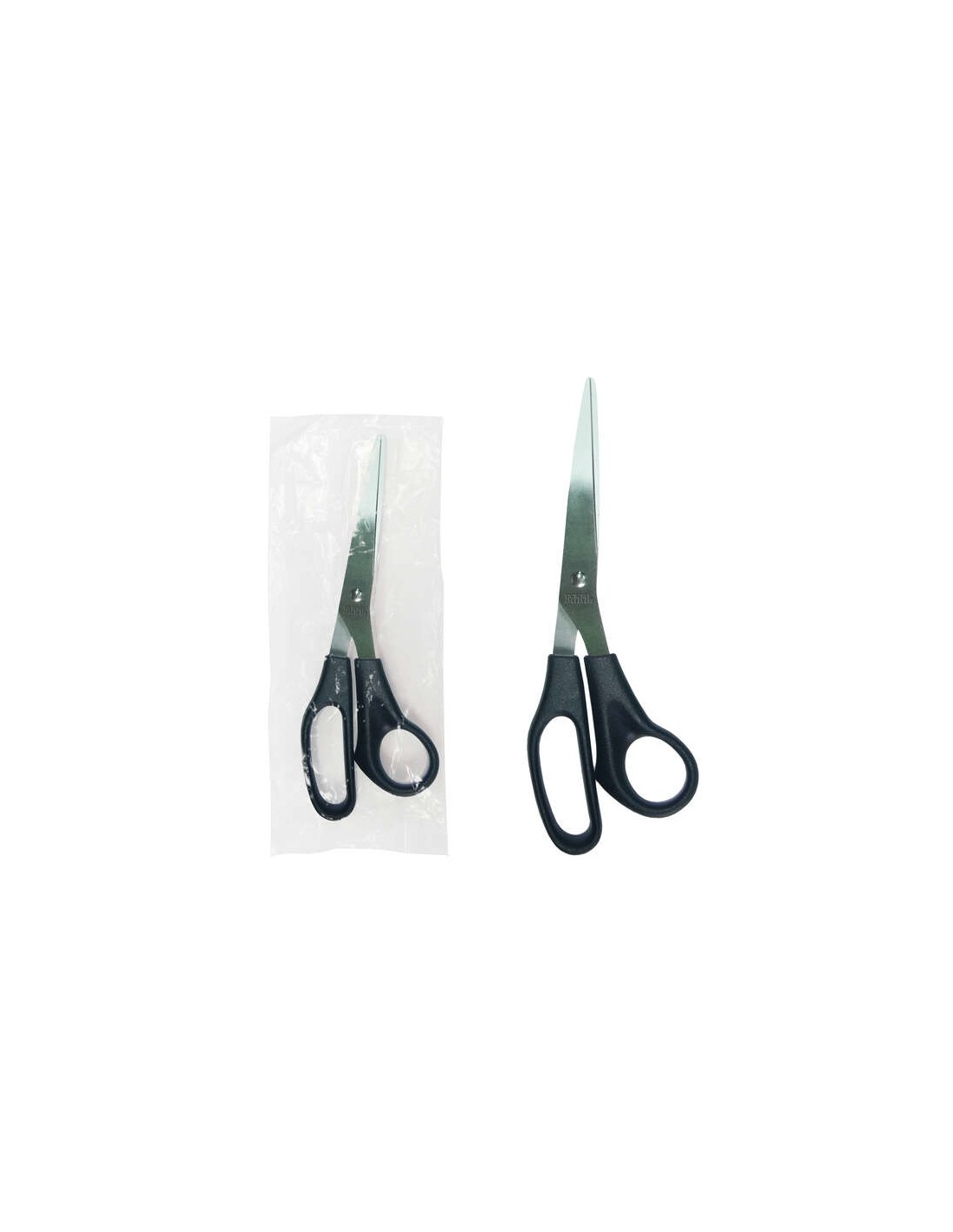 Tijera de acero inoxidable y puntas redondeadas. Con mango ergonómico de plástico. Color negro. En bolsa de plástico individual