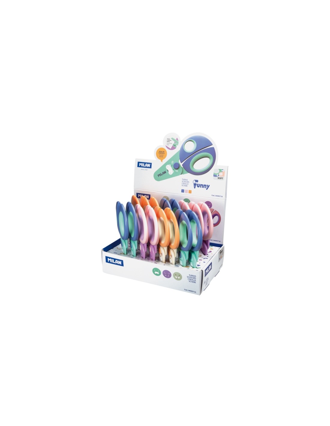 Milan Funny Expositor con 16 Tijeras - Punta Redondeada para Infantil - Hojas de Plastico de Seguridad - Colores Surtidos