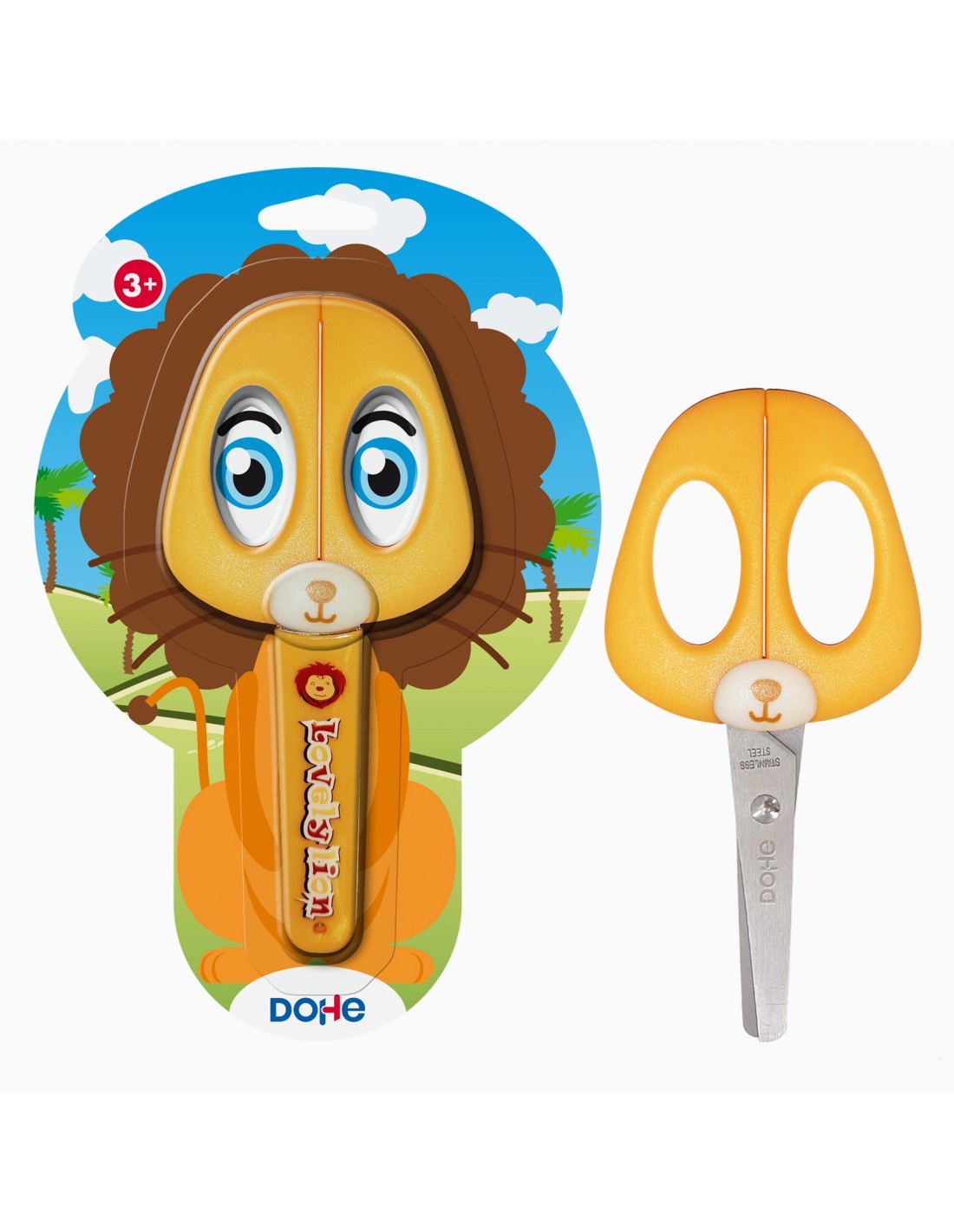 Dohe Tijera Escolar para Niños - Acero Inoxidable - Puntas Redondeadas - Funda para las Hojas - Diseño Leon