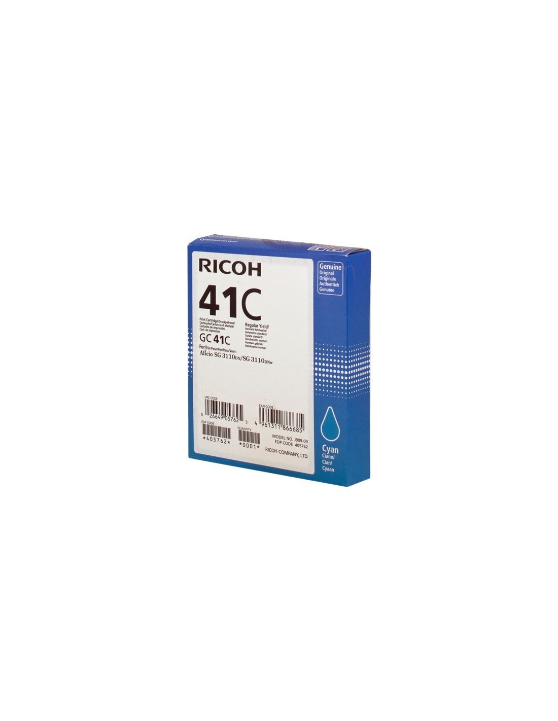 Cartucho de gel original Ricoh GC41 (405762) de alta calidad. Adecuado para uso en las siguientes impresoras: Ricoh Aficio SG 2100N Ricoh Aficio SG 2110N Ricoh Aficio SG 3110DN Ricoh Aficio SG 3110DNW Ricoh Aficio SG 7100DN Ricoh Aficio SG K3100DN Ricoh Aficio SG 3110SFNw Ricoh Aficio SG 3100SNw Ricoh Aficio SG 3110N Ricoh Aficio SG 3120 B SF Ricoh Aficio SG 3120 B SFN Ricoh Aficio SG 3120 B SFNw Rendimiento: 2.200 Páginas