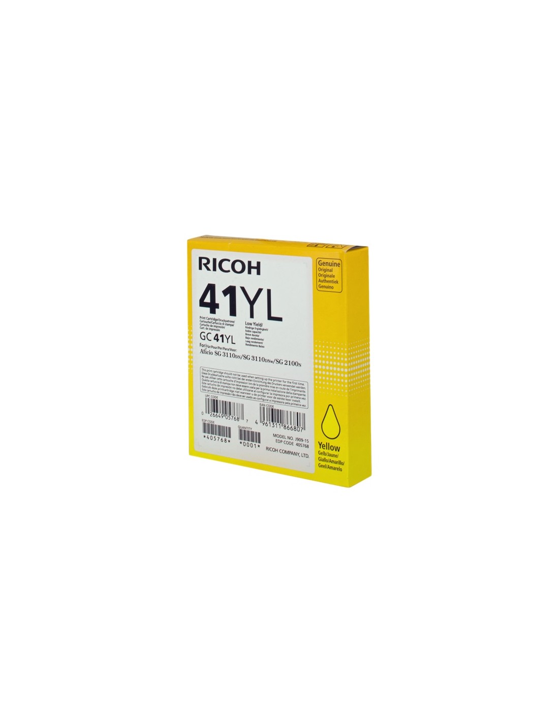 Cartucho de gel original Ricoh GC41YL (405768) de alta calidad. Adecuado para uso en las siguientes impresoras: Ricoh Aficio SG 2100N Ricoh Aficio SG 2110N Ricoh Aficio SG 3110DN Ricoh Aficio SG 3110DNW Ricoh Aficio SG 7100DN Ricoh Aficio SG K3100DN Ricoh Aficio SG 3110SFNw Ricoh Aficio SG 3100SNw Ricoh Aficio SG 3110N Ricoh Aficio SG 3120 B SF Ricoh Aficio SG 3120 B SFN Ricoh Aficio SG 3120 B SFNw Rendimiento: 600 Páginas