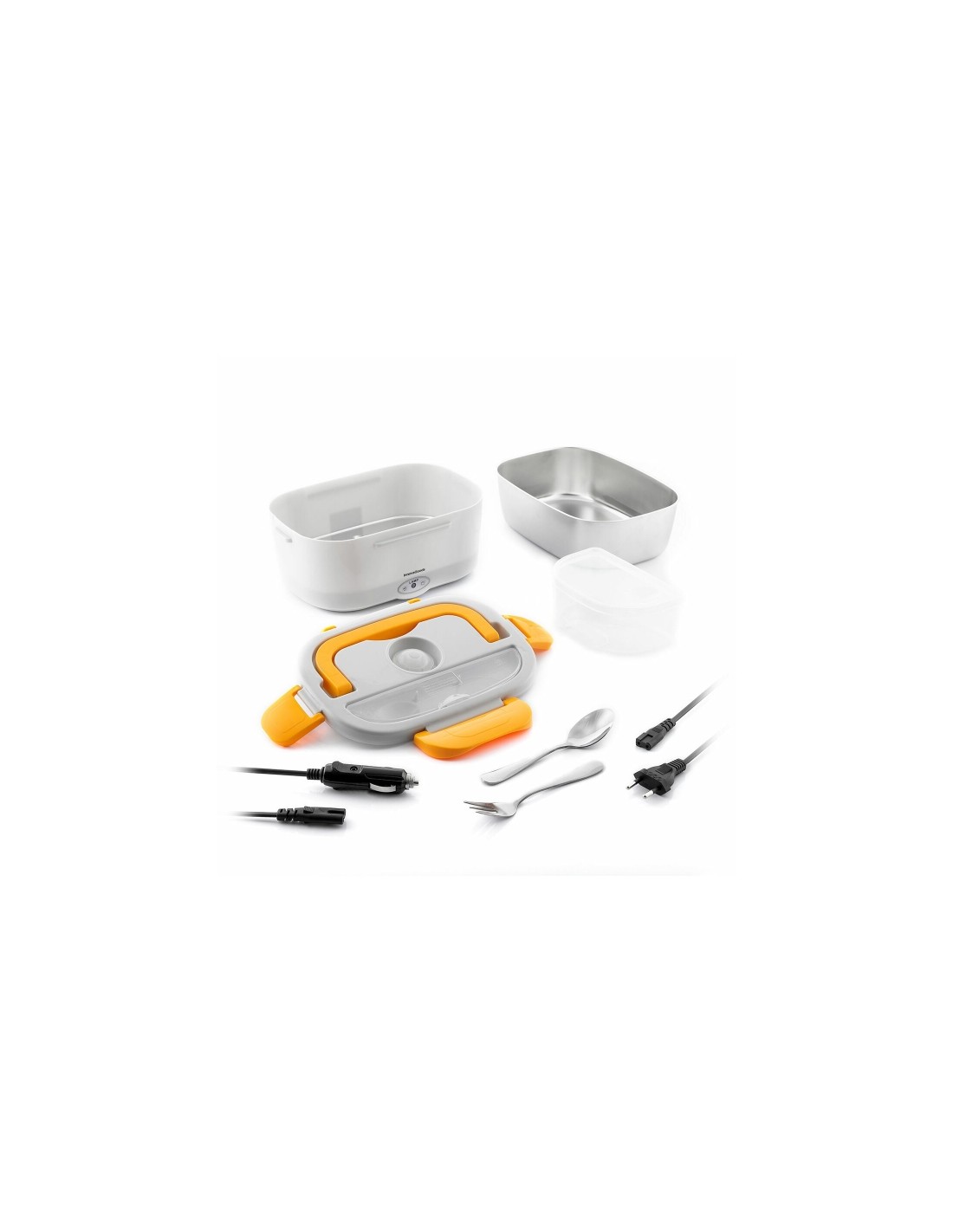 Fiambrera El ctrica para Oficina y Coche Lunffi InnovaGoods. Esta fiambrera el ctrica para oficina y coche calienta la comida f cilmente. Incluye cuchara, tenedor, 2 recipientes extra bles, 2 cables de conexi n, v lvula de vapor, borde antifugas, 4 cierres de seguridad y asa plegable. M x. 90 ºC, 60 W, 1.5 L. Una completa fiambrera el ctrica muy c moda y eficaz para calentar la comida en el trabajo sin microondas. Ideal para disfrutar de comida casera en cualquier momento y lugar. Tapa con cubiertos y v lvula: la fiambrera el ctrica tiene una capacidad de 1.5 L. Dispone de tapa con v lvula de expulsi n de vapor y compartimento para cubiertos. Incluye cuchara y tenedor de acero inoxidable. Adem s, la tapa cuenta con 4 cierres de seguridad, borde antifugas para un sellado ptimo y asa de transporte plegable. Recipiente de acero inoxidable: esta fiambrera el ctrica te permite calentar los alimentos con total comodidad y seguridad. Dispone en su interior de un recipiente extra ble de acero inoxidable para depositar la comida que desees calentar. Contenedor de pl stico con tapa: la fiambrera el ctrica incluye tambi n en su interior un peque o contenedor de pl stico con tapa para ensalada, postre u otros alimentos que no se calientan. Este accesorio es totalmente independiente y extra ble. Cables extra bles para coche y oficina: esta fiambrera el ctrica tiene una potencia de 60W y alcanza hasta 90 ºC de temperatura. Incluye 2 cables de conexi n extra bles: un cable con adaptador 12V para conectarla al mechero del coche y otro cable con enchufe para conectarla a la red el ctrica de la oficina u otro lugar. F cil de usar, transportar, limpiar: la fiambrera el ctrica multifunci n es ligera y compacta, f cil de transportar y guardar. Podr s llevarla al trabajo y calentar tu comida con facilidad y rapidez en el coche o en la oficina, sin necesidad de microondas. Los recipientes contenedores de comida son extra bles y aptos para lavavajillas. Caracter siticas: -Material: Polipropileno / Acero Inoxidable -Color: Gris / Naranja -Tipo: Fiambrera El ctrica -Uso principal: Ideal para oficina, coche, etc. -Capacidad: 1.5 L -Temperatura m x.: 90 ºC -Asa de transporte: Plegable -Tapa con compartimento para cubiertos. -Cierre de seguridad -V lvula de expulsi n de vapor -Incluye: Cuchara y tenedor -Bandeja extra ble: Apto para lavavajillas -Recipiente contenedor: Extra ble y con Tapa -Apto para lavavajillas -Potencia: 60 W -Cable de Alimentaci n: Cable extra ble -Tipo de enchufe: C -Longitud del cable: 80 cm -AC In: 220-240V / 50-60 Hz -Cable adaptador para el coche (12 V): -Cable extra ble -5 A / Fusible 15 A -Medidas aprox.: 23.5 x 10.5 x 17 cm -Packaging y manual en 24 idiomas: ingl s, franc s, espa ol, alem n, italiano, portugu s, holand s, polaco, h ºngaro, rumano, dan s, sueco, fin s, lituano, noruego, esloveno, griego, checo, b ºlgaro, croata, eslovaco, estonio, ruso, let n.