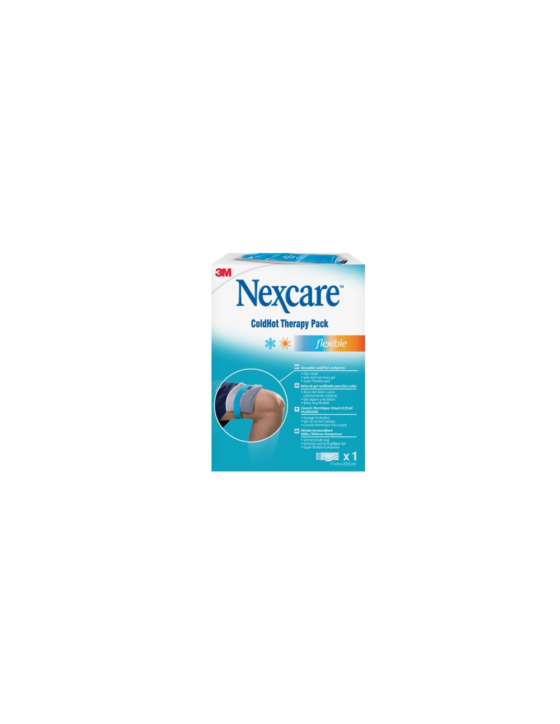 Nexcare ColdHot Therapy Pack Flexible est dise ado para proporcionar fr o o calor superficial. La terapia de fr o ayuda a disminuir la hinchaz n, la inflamaci n y el dolor. La terapia con calor ayuda a reducir el dolor, calma y relaja. El gel es seguro para todos los miembros de la familia y no contiene componentes t xicos. Alivie el dolor y la inflamaci n mediante termoterapia sin medicamentos con nuestras bolsas para terapia de fr o y calor Nexcare Coldhot. Nuestras compresas pueden utilizarse en caliente o en fr o y son una soluci n para quienes prefieren someterse a una terapia sin medicamentos muy f cil de usar. Los productos se pueden guardar en el frigor fico o el congelador y calentar con agua caliente o en el microondas. Am sela para distribuir el calor uniformemente. Introduzca siempre la bolsa de gel en la funda suministrada o envu lvala en una toalla limpia antes de que entre en contacto con la piel. Se incluye una funda protectora que permite usar la bolsa de gel de forma r pida, f cil y c moda, adem s de proteger la piel. La funda Thinsulate de alto rendimiento ayuda a mantener la temperatura constante de la compresa durante m s tiempo. Las bolsas de gel se dividen en 3 c maras independientes para ofrecer mayor flexibilidad en la aplicaci n a las partes del cuerpo, sobre todo cuando se envuelven alrededor de brazos o piernas. La tira el stica ajustable proporciona un agarre estable y seguro. Caracter sticas: -Termoterapia sin medicamentos -La terapia con fr o se recomienda para esguinces, por ejemplo, de los tobillos