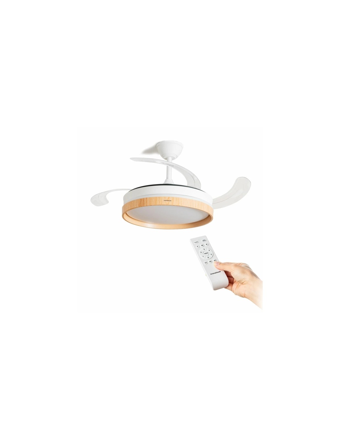 InnovaGoods presenta su ventilador de techo con luz LED y aspas retr ctiles Woteez, una soluci n moderna y eficiente para mantener tu hogar fresco y bien iluminado. Con un dise o elegante en madera, blanco y transparente, este ventilador combina funcionalidad y estilo, adapt ndose f cilmente a cualquier decoraci n. Equipado con un motor DC de bajo consumo y funcionamiento silencioso, ofrece 6 velocidades ajustables (170-230 rpm) y un temporizador de 1, 2 o 4 horas para mayor comodidad. Sus aspas retr ctiles de PC, que se pueden plegar y ocultar, permiten transformar el ventilador en un elemento discreto cuando no se usa, ideal para estancias de entre 10 y 25 m . Este modelo tambi n funciona como l mpara LED, proporcionando una iluminaci n eficiente con 48 LED SMD (4000 l ºmenes, 40 W) en tres modos de luz: fr a, c lida y neutra, con temperaturas de color ajustables entre 3500 y 6500 K. Incluye un mando a distancia para controlar todas sus funciones de forma sencilla y c moda. Su estructura en hierro, ABS y policarbonato garantiza durabilidad y resistencia, mientras que su dise o moderno y silencioso lo hace perfecto para cualquier ambiente, ya sea en el hogar, oficina o espacio de descanso. Con instrucciones de montaje ilustradas y accesorios incluidos, este ventilador combina innovaci n, eficiencia y estilo para crear un ambiente agradable y bien iluminado en tu hogar. Caracter sticas: -Material: ABS, hierro, policarbonato -Color: madera, blanco, transparente -Tipo: ventilador de techo con luz -Di metro aproximado: 49-104 cm -Aspas retr ctiles: 4 -Alcance aproximado: hasta 25 m -Propiedades: silencioso -Funci n verano-invierno -Velocidades: 6 -Velocidad de rotaci n: 170-230 rpm -Temporizador: 1/2/4 horas -Luz LED: 48 SMD LED / 20 20 W -Modos de iluminaci n: fr a, c lida, neutra -Temperatura de color: 3500-6500 K -Flujo luminoso: 4000 l ºmenes -Mando a distancia: s (pilas no incluidas) -Motor DC: 24V / 0.255 A / 32 W -Clasificaci n energ tica: E -Consumo de energ a: 32 kWh / 1000 h -Potencia: 72 W -Entrada AC: 110-240V / 50 Hz -Medidas aproximadas: 49 x 42cm / 104 x 42 cm -Incluye instrucciones de montaje y accesorios