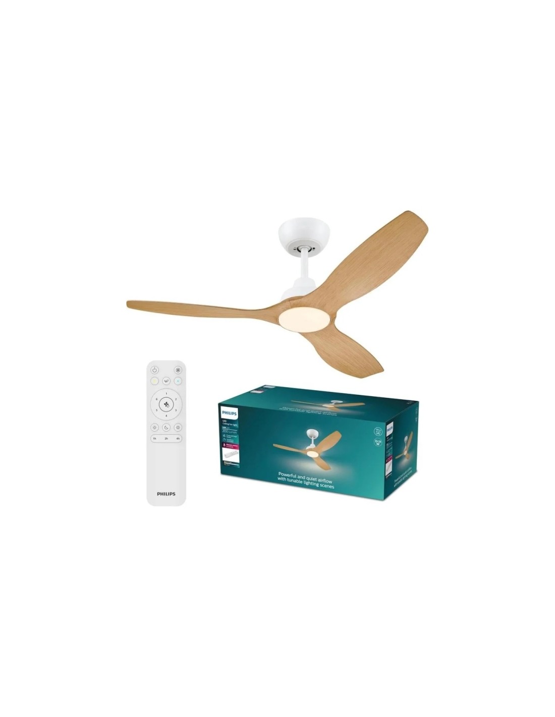 Disfruta de un ambiente fresco y luminoso con el ventilador de techo Philips Olas, dise ado para ofrecer confort y eficiencia en cualquier estancia. Caracter sticas: Refrigeraci n y luz en un solo dispositivo. El Philips Olas combina un potente ventilador de techo con una luminaria LED regulable, proporcionando un flujo de aire de hasta 190 m /min y una iluminaci n ajustable de 2650 l ºmenes. Su motor de corriente continua (DC) garantiza un funcionamiento silencioso, ideal para dormitorios, despachos o salones donde el confort ac ºstico es esencial. Control total y personalizaci n. Ajusta la velocidad entre seis niveles y selecciona la temperatura de color de la luz blanca (de 3000 K a 6500 K) para adaptarla a cualquier momento del d a. El mando a distancia incluido permite gestionar todas las funciones sin moverte, facilitando la experiencia de uso y la integraci n en hogares inteligentes. Uso durante todo el a o. Gracias a la funci n de inversi n de giro, el ventilador puede utilizarse tanto en verano para refrescar como en invierno para distribuir el aire caliente, optimizando el consumo energ tico y el confort t rmico. Instalaci n segura y dise o robusto. El soporte de techo estable y las aspas perfectamente equilibradas minimizan el bamboleo y evitan da os estructurales. El acabado en blanco/madera se integra en cualquier decoraci n moderna o cl sica. Incluye mando a distancia, eliminando la necesidad de adquirir accesorios adicionales. Si buscas eficiencia, silencio y versatilidad en climatizaci n e iluminaci n, el Philips Olas es la soluci n profesional definitiva. Descubre c mo transformar tu espacio y mejora tu calidad de vida. Especificaciones: -Tipo: Ventilador de techo con luz LED -Di metro: 132 cm -Aspas: 3 -Flujo de aire: 190 m /min -Velocidades: 6 (ajustables) -Direcci n de giro: Reversible (verano/invierno) -Iluminaci n: LED regulable, 2650 l ºmenes, 3000 K a 6500 K -Regulaci n de luz: Desde el 5 -Color: Blanco/Madera -Dimensiones: 132 x 132 x 31 cm -Peso: 4,3 kg -Voltaje: 230 V -Fuente de alimentaci n: Corriente continua (DC) -Consumo energ tico: Etiqueta energ tica E -Incluye mando: S